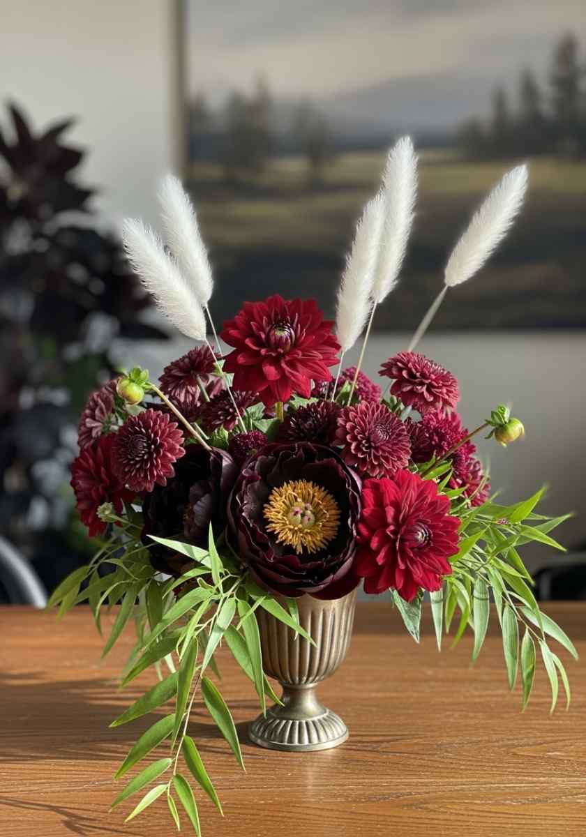 This arrangement is a secret weapon for home offices because it looks neat even on messy days. Count it among fall floral arrangements that pull in texture without screaming about it.