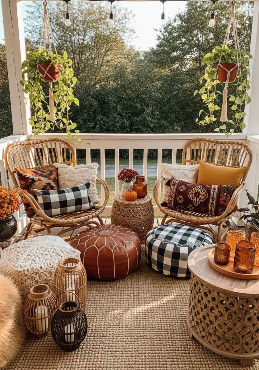 This one had me staring. Gray wicker furniture with big comfy cushions sits on a dark woven rug. There’s a chunky knit blanket tossed casually and potted herbs with mini pumpkins on the table. But what really sells it? That dreamy golden light from the trees.