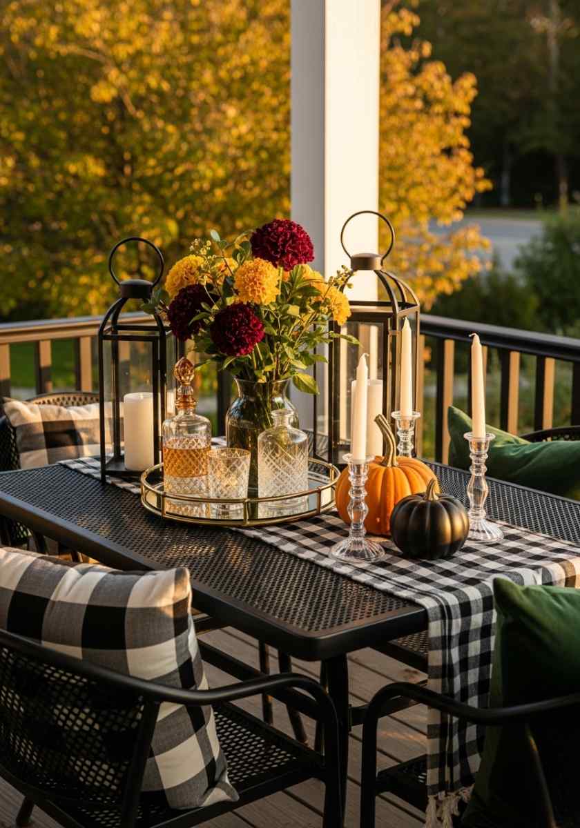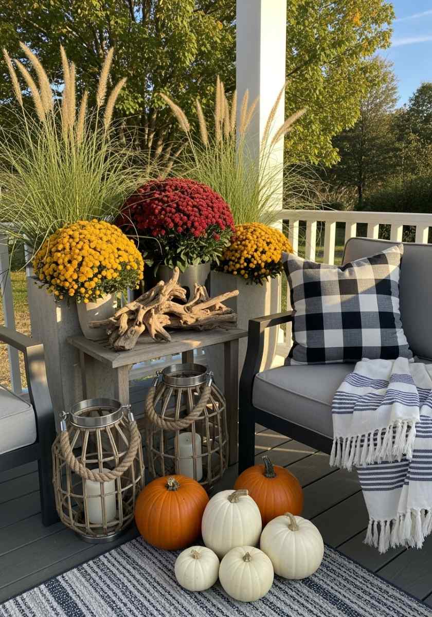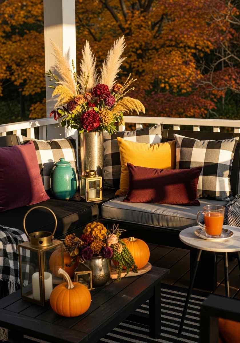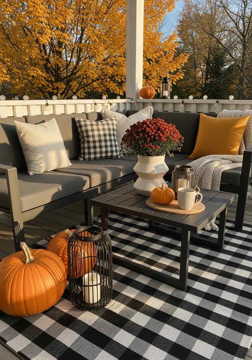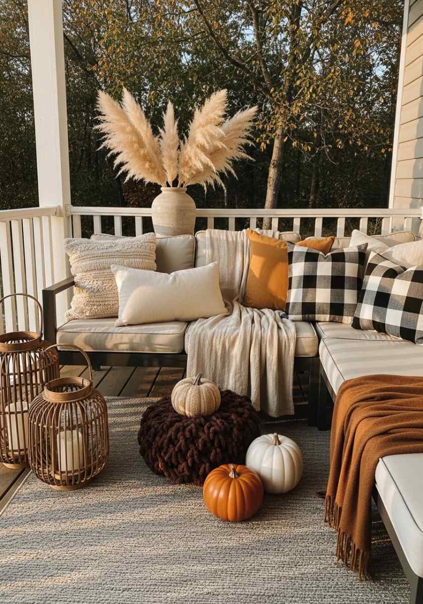 Set an oatmeal-and-greige palette and let texture lead. Woven lanterns, matte ceramic pumpkins, nubby pillows, and linen-look runners play together quietly. A tall vase of dried pampas adds drama without bright color. Metals stay soft—brushed brass or bronze. A greige rug grounds the whole scene. One cinnamon-colored throw for contrast is enough. This flavor of fall patio decor is calm but still clearly seasonal.