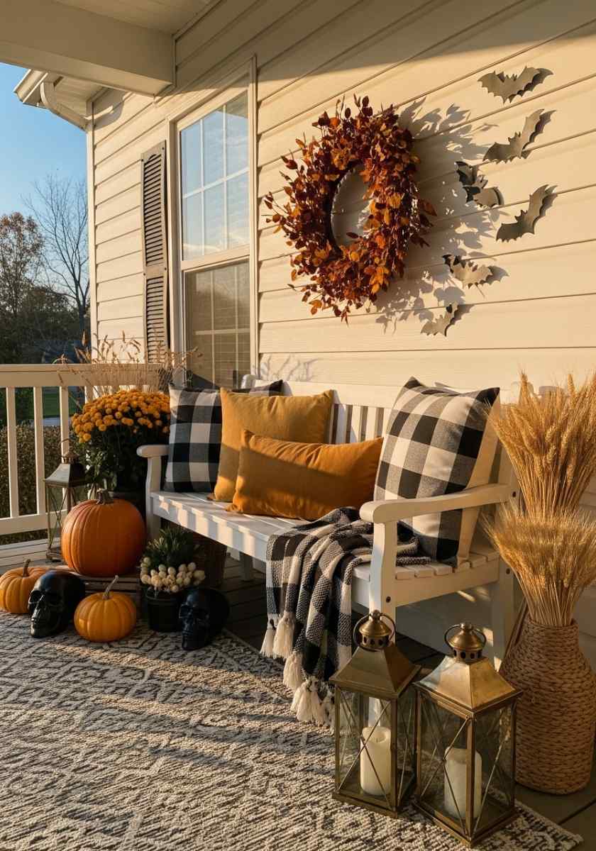Tip: Stack pumpkins, layer planters, and don’t be afraid to hang stuff! Wreaths and hanging baskets pull the eye up and make it feel full without clutter.