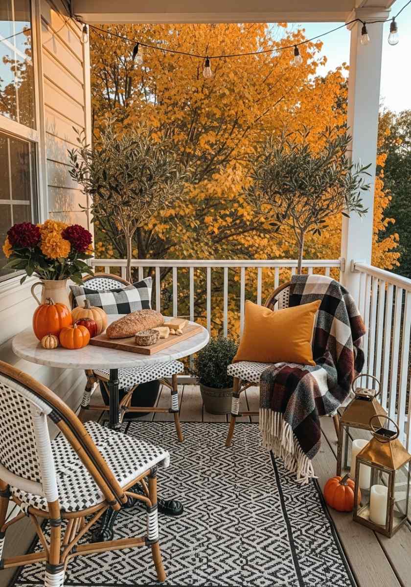 Channel a tiny café: marble-look bistro table, classic café chairs, and a strand of warm string lights overhead. Slide two slender olive or bay laurel trees into matching planters. A small herringbone outdoor rug feels like a cobbled lane (without the wobbly). Style a bread-and-cheese board and tuck a wool throw on each chair. Brass lanterns and tiny ceramic pumpkins finish with a wink, not a shout.