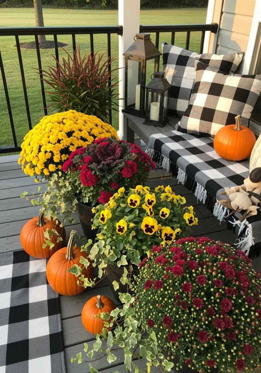 Water on schedule and rotate containers a quarter-turn weekly toward the sun. This is fall patio decor that stays cheerful into the chill.