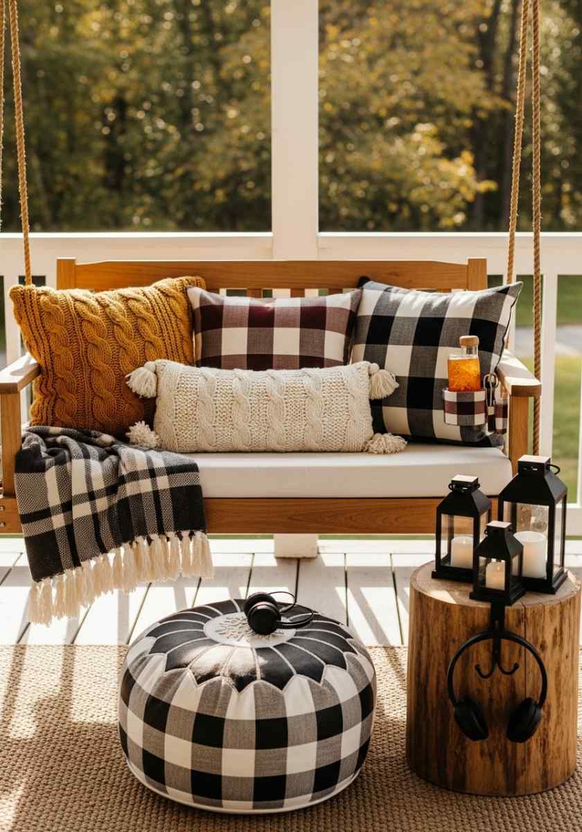 Dress a porch swing with knit pillows and a slim plaid lumbar. Clip a drink caddy on the arm so mugs don’t take dives. A lantern trio sits on a tree-stump side table for a little woodland moment. Add a pouf for feet and a rug underfoot. A small hook takes headphones or a throw. Check swing clearances—no lanterns in the arc, please—and use shatterproof candles. Cozy, simple, highly nap-able.