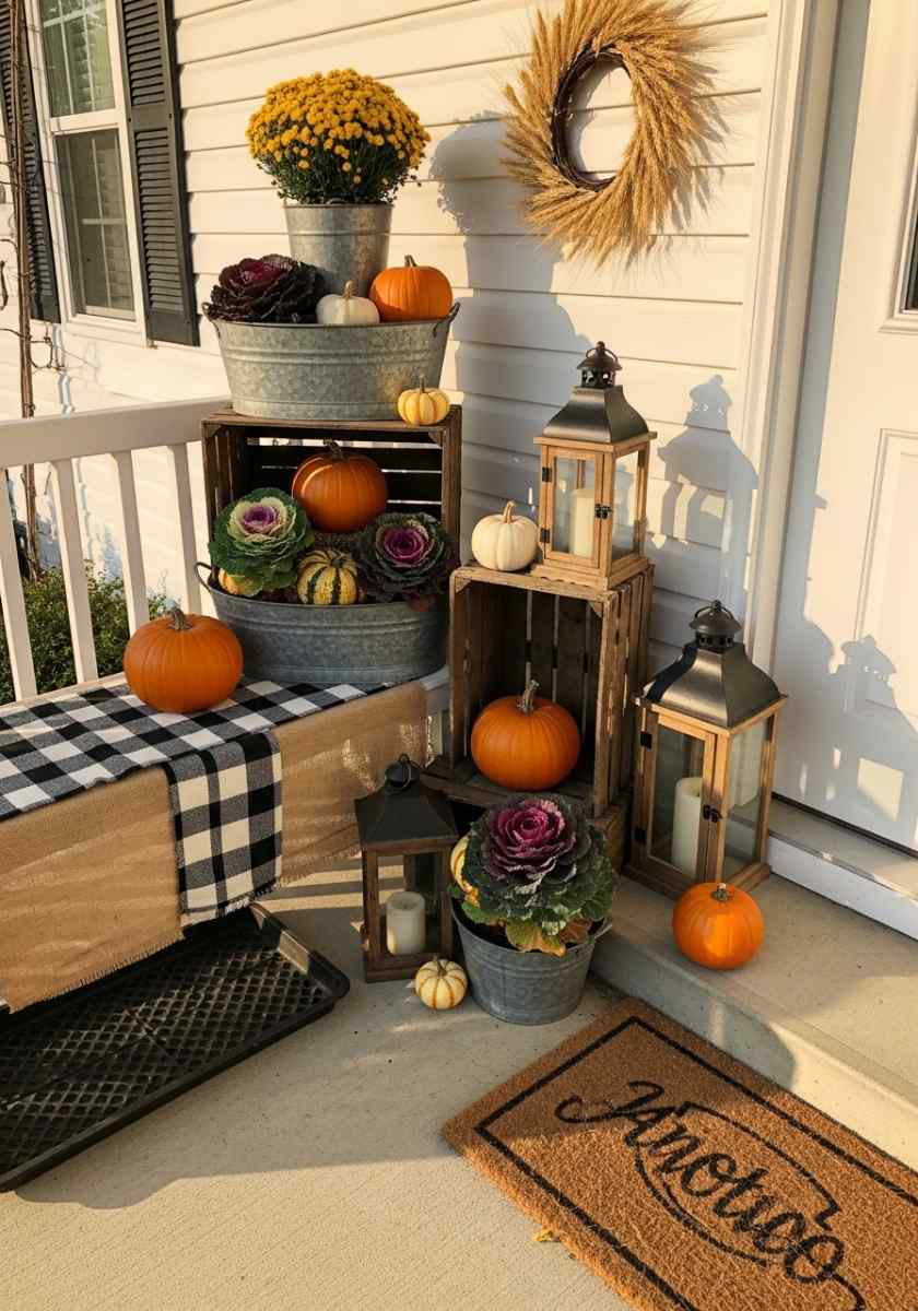 Stack wooden crates into a tiered display near the door, then nestle pots of mums at different heights for a fresh farm-stand vibe. Layer in galvanized tubs with ornamental cabbage and a few pumpkins (mix sizes; odd numbers look best). A simple wheat wreath on the door adds texture without yelling.