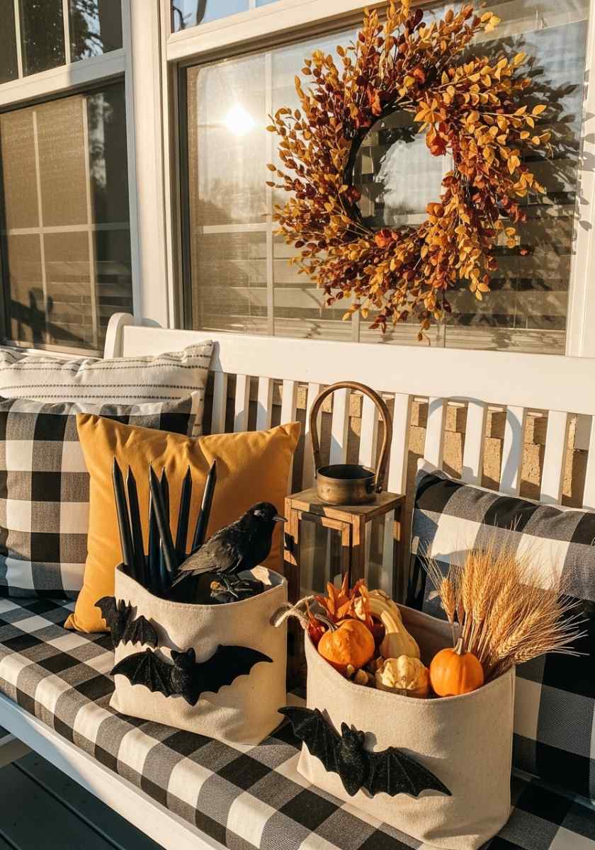Make a modular kit so the seasonal change is outrage-free. In one lidded crate: black tapers, velvet bats, faux raven. In a second pouch: brass tapers, mini gourds, wheat picks. Keep base decor neutral (beige pillows, clear lanterns, natural wreath). Schedule a 10-minute swap routine on your phone. Store the crate under a bench. Quick swaps keep fall patio decor fresh and your sanity together.