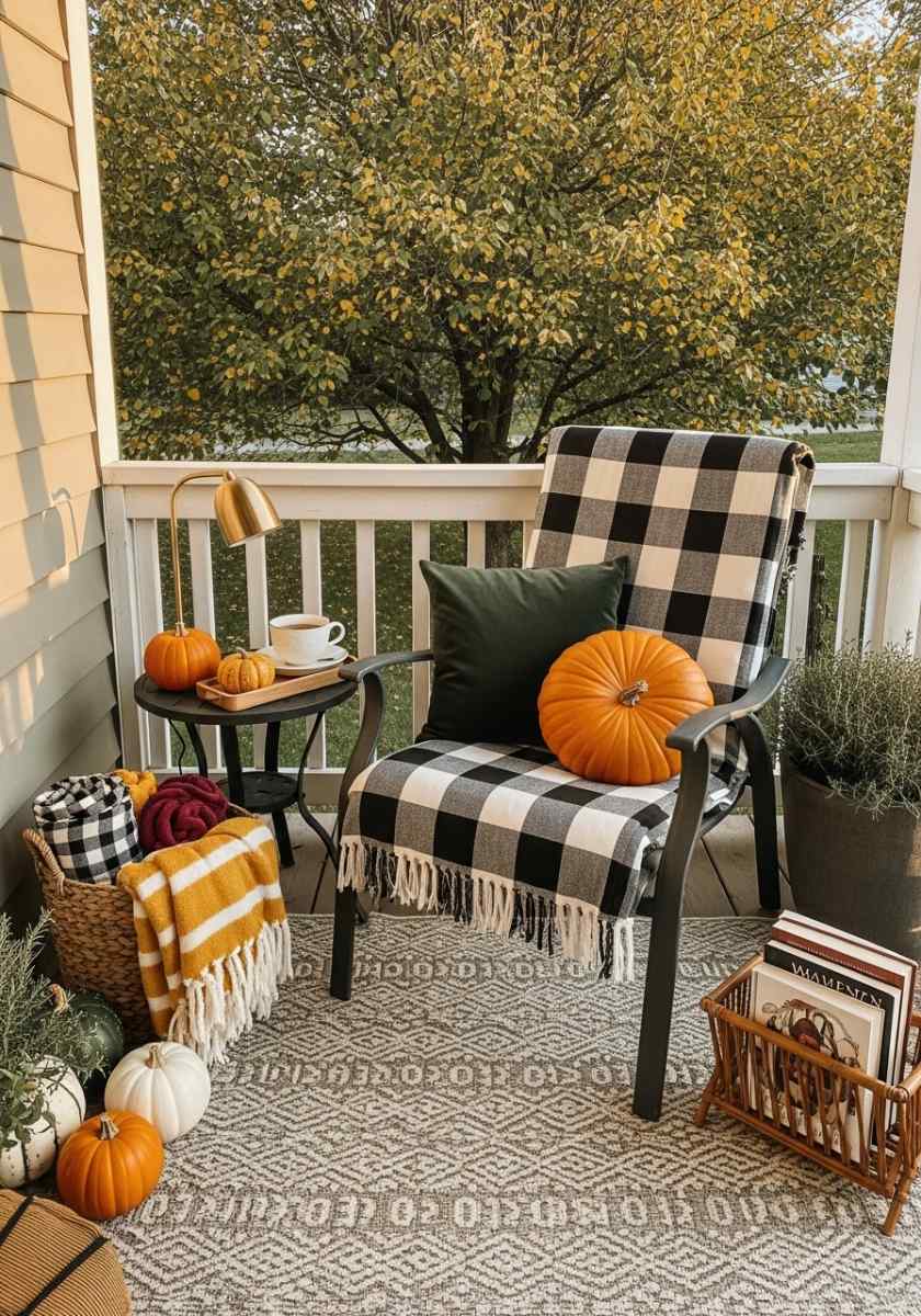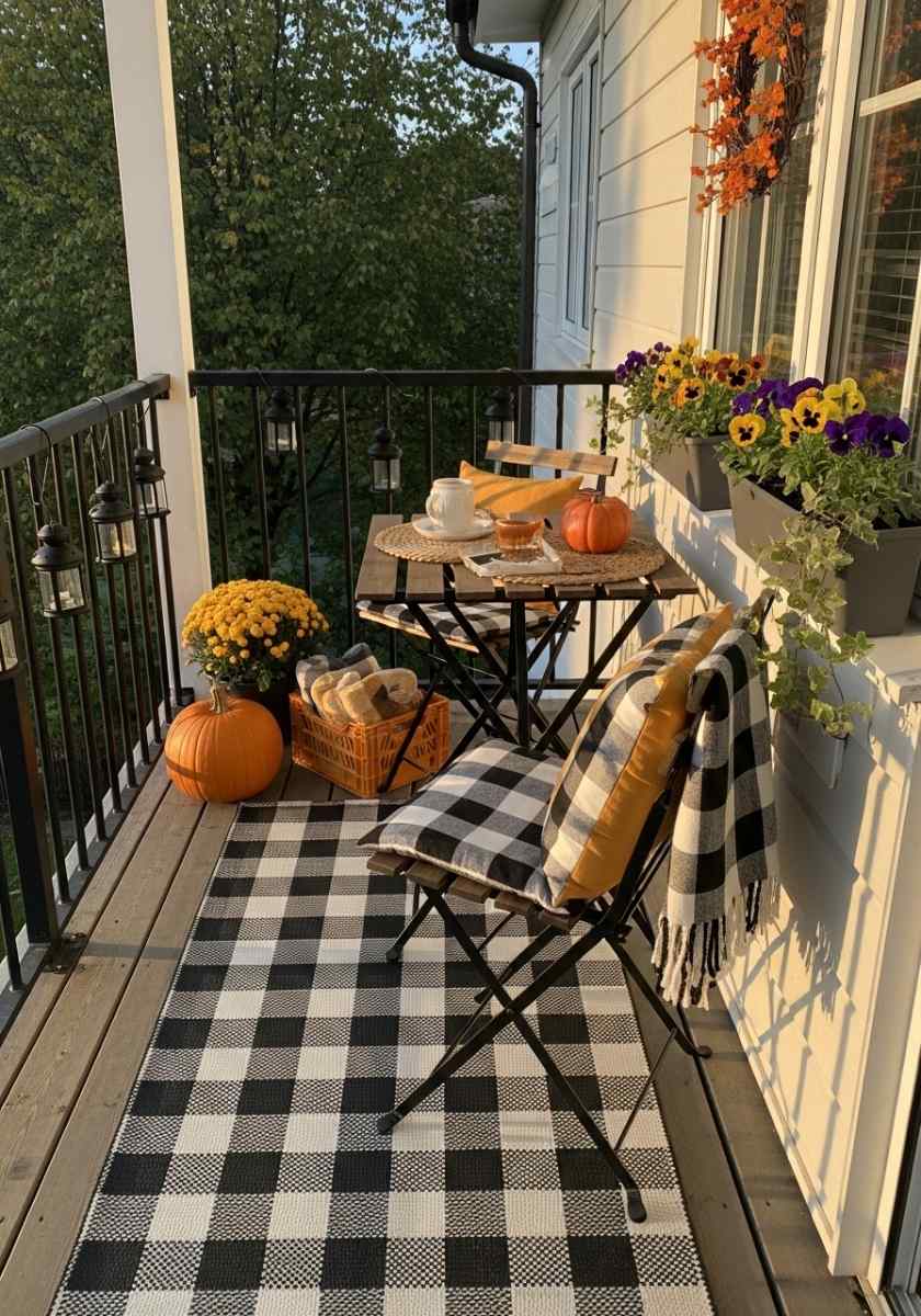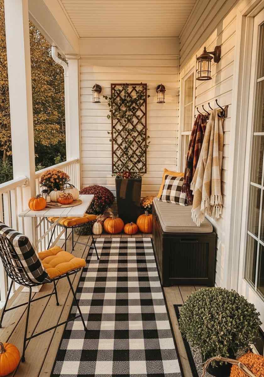 Tiny space, big vibe. A folding bistro set is your start. Add narrow ledge planters with pansies and trailing ivy. A slender lantern chain clips to the railing. A reversible runner rug doubles styling options without storage drama. Tuck a collapsible crate under the chair for throws or a little snack basket. One statement pumpkin is better than five little ones; scale matters in micro spaces. A compact wall hook holds a seasonal wreath.
