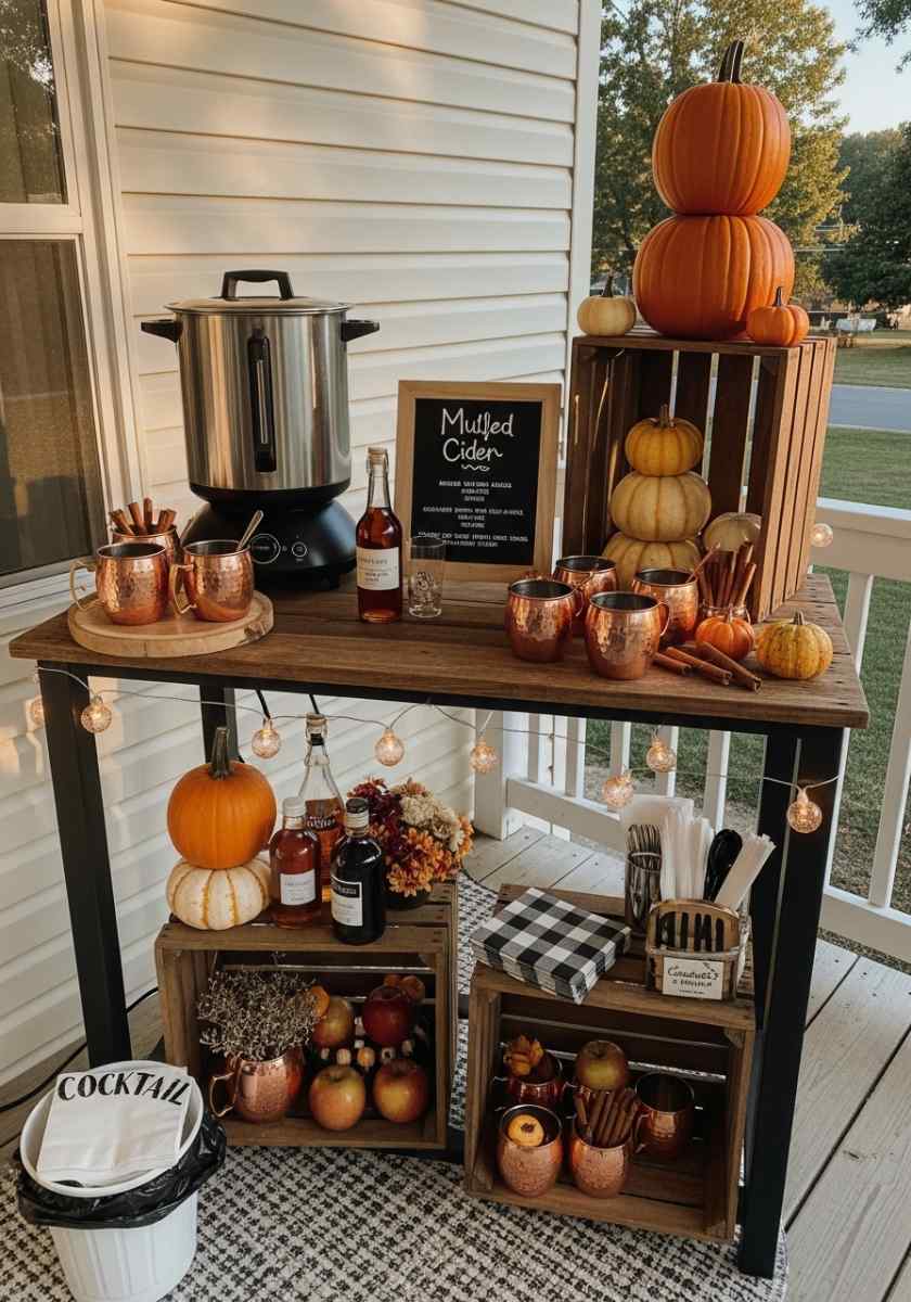Set a mulled-cider station with an electric warmer (safer outside), then line up copper mugs on a wooden tray. Stage apples, cinnamon sticks, and star anise in crates.