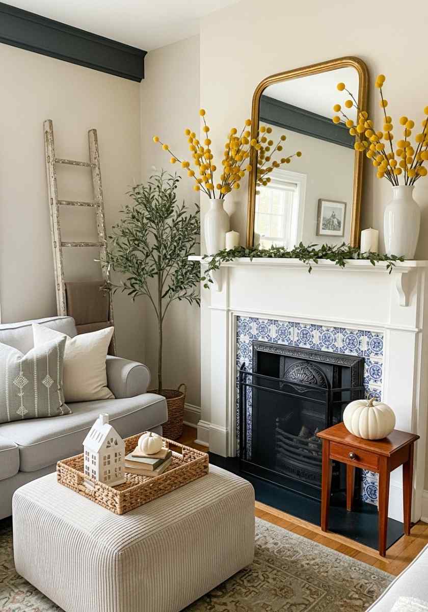 Blue-and-white tile around the fire brings heritage charm, while small white pumpkins keep it seasonal but calm. Copy this fall rustic living room decor move by pulling together three textures on your coffee table: a woven tray, matte ceramic, and a linen-covered book.