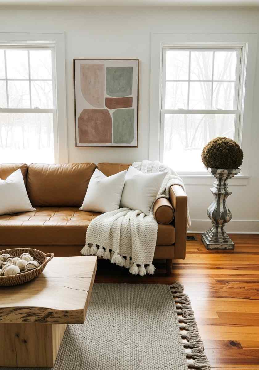 Color is simple: warm leather, soft white, and a touch of sage and clay in the painting. If you’re hunting for fall rustic living room decor, a leather piece is the MVP. Pair it with creamy textiles, not matchy-matchy orange.