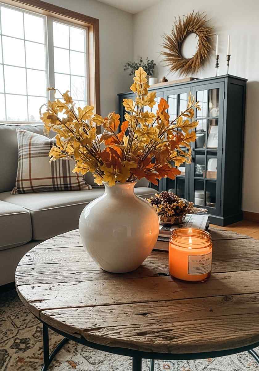 Sometimes the whole mood lives on the table. A planked, round coffee table carries a round ceramic vase filled with golden leaves. There’s a single amber candle giving off that cozy glow. The plaid pillow on the sofa and the wheat wreath across the room keep the palette consistent.