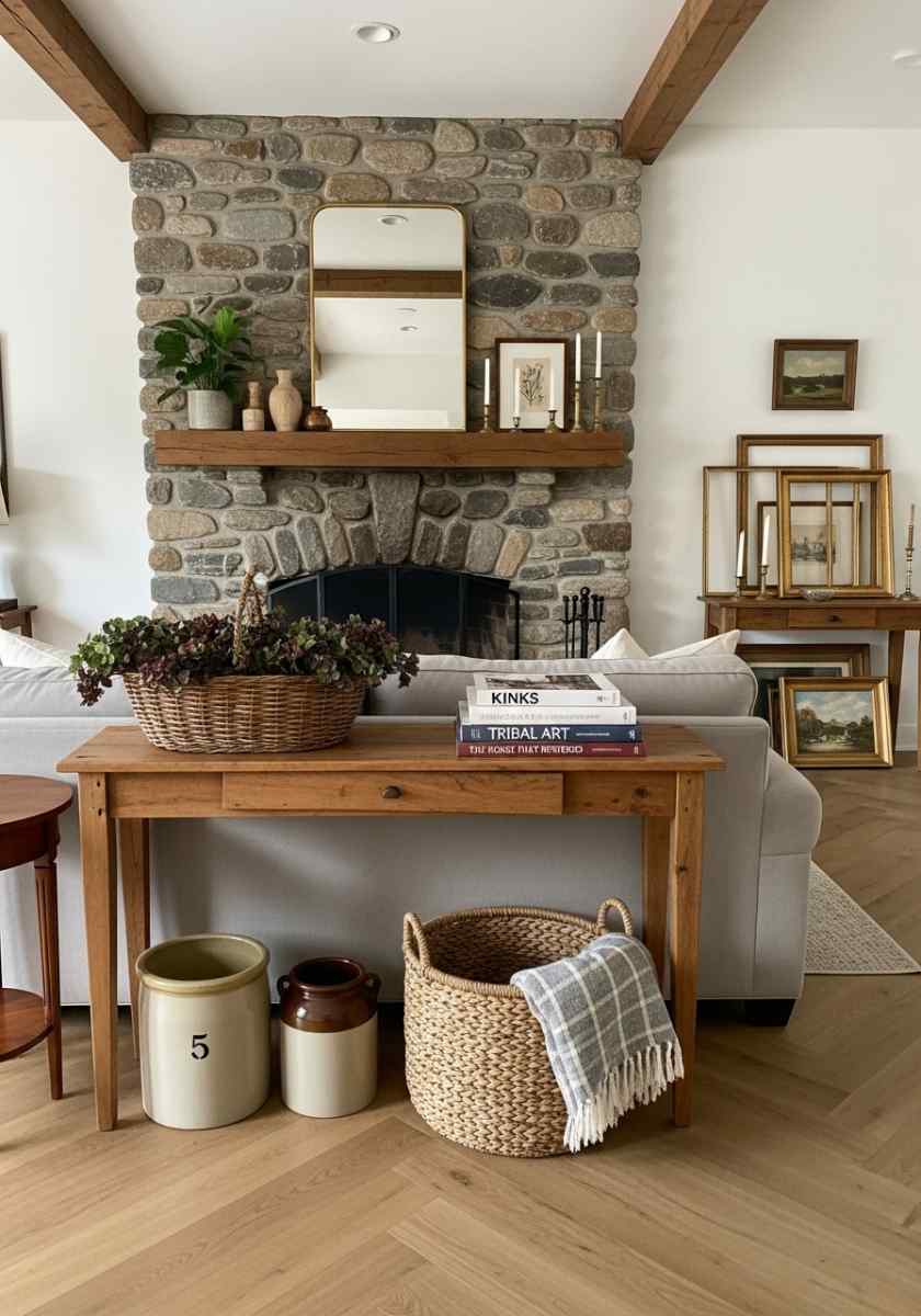 I’m obsessed with this river-stone fireplace and chunky wood beam. Notice the restraint: one arched mirror, a small plant, and a trio of skinny brass candlesticks. A console behind the sofa holds a basket, crocks, and art books, adding earthy weight without clutter.