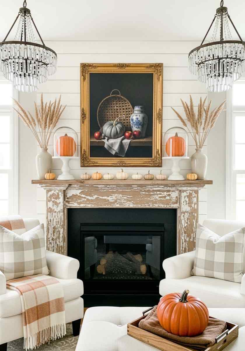 This one had me saying wow out loud. A timeworn mantel, all chipped and perfect, sits under an old-world still life in a gold frame. On either side, pampas grass and cloche-covered pumpkins create a balanced scene. Then a parade of mini pumpkins runs across the ledge like candy.