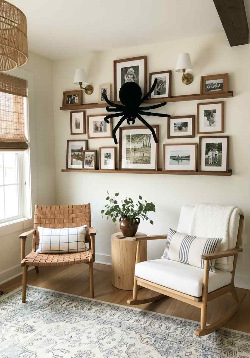 Design is allowed to be fun. This sweet nook has warm wood frames lined up on ledges, then—surprise—a huge fuzzy spider crawling across the art. The chairs are simple and Scandinavian, with woven leather and a light rocker. A small turned wood stool becomes a side table with a single clay pot of greenery.