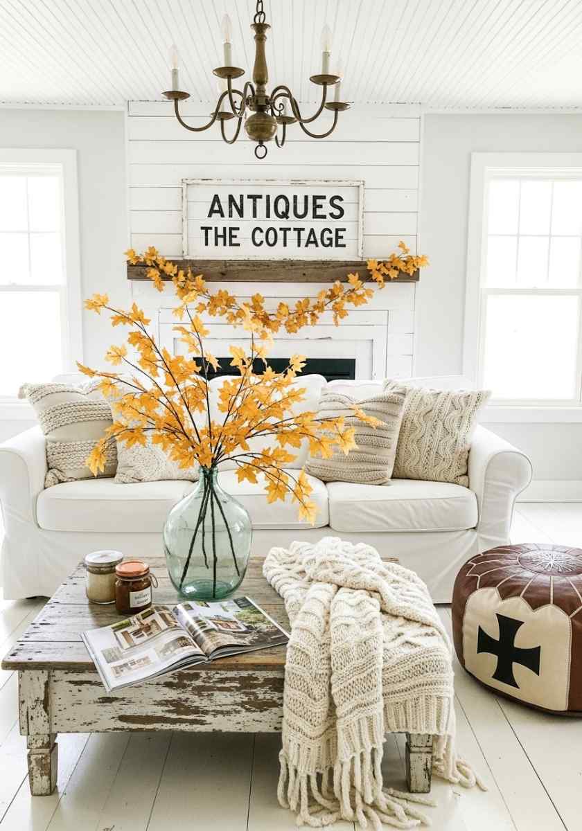 White slipcovered sofa, shiplap walls, a weathered coffee table, and an antique sign. I swear you can smell cinnamon right through the screen. The hero is a giant glass jug with branches of mustard leaves. Knit pillows and a chunky throw bring the texture that rustic fall decor for living room spaces always need.
