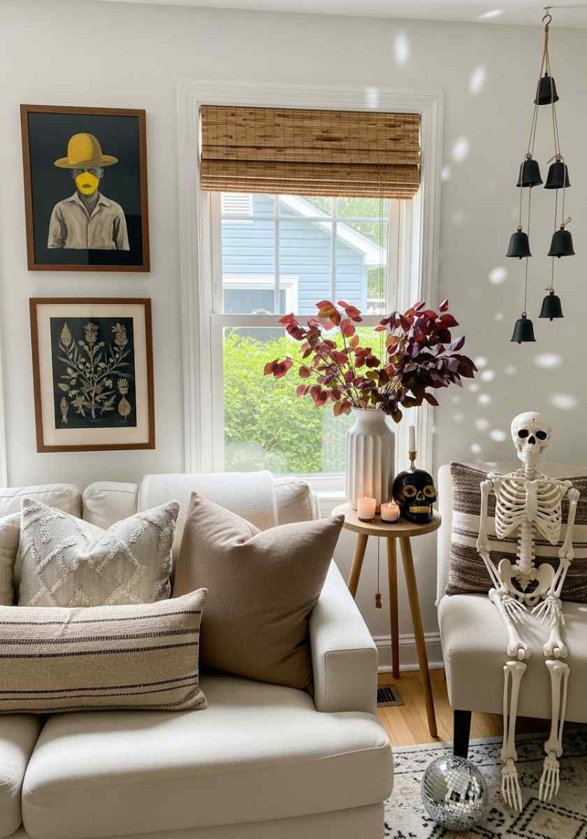Yes. Add one playful piece like a skeleton, bat garland, or a witch hat. Keep everything else neutral and textural.