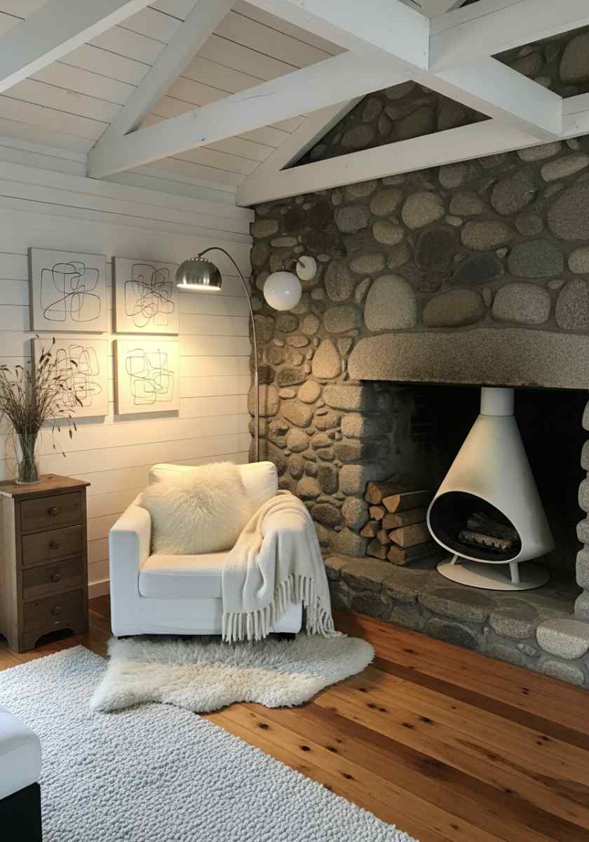 If I disappeared for a weekend, I’d be in this exact chair with a novel. The corner pairs a white modern cone stove with a massive river-rock hearth. A low white armchair sits on a sheepskin, wrapped in a wool throw. Lighting is gentle and warm. Art is line drawings, nothing fussy.