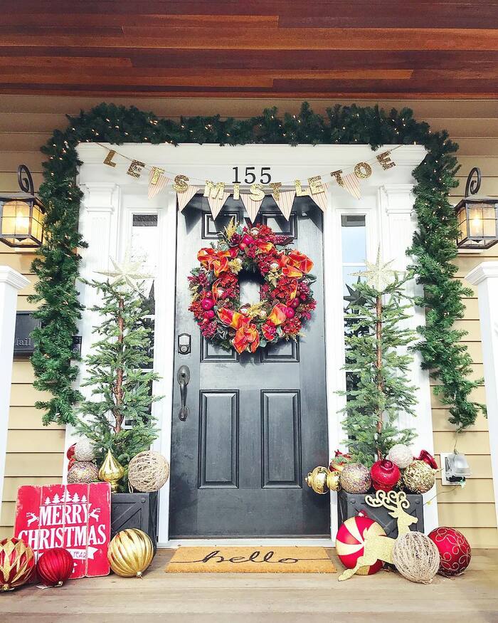 This porch hits you first with a full garland frame twinkling around the door, then a big red wreath grabs the spotlight. The balance is friendly and dramatic at once. I like the mix of shiny balls, ribbon tails, and a few natural bits tucked in. The flanking mini trees feel like cheerful bodyguards and the scattered oversized ornaments at the base add that playful, kid-smile energy. If you want farmhouse Christmas front porch decor that reads festive from the street, this does it.