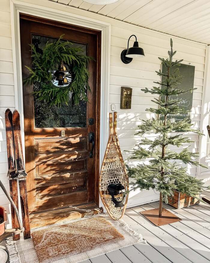 This last porch is cozy-cabin meets studio apartment, and I mean that as a compliment. A single skinny tree, a shaggy green wreath, and vintage skis plus a snowshoe leaned upright. It feels collected, like the owner actually goes outside. If you love stories and stuff with history, this is your Christmas farmhouse porch decor moment.