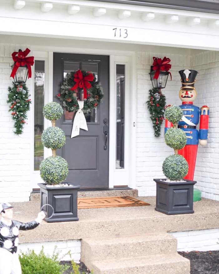 Clean white brick, charcoal door, and matched topiaries give this porch a crisp, almost tailored feel. Then the nutcracker shows up and says, surprise, this is still a party. I love the two mini wall swags with red bows by the lanterns. They bring the eye up so the space feels tall. This is classic Christmas farmhouse porch decor you can set in an afternoon.