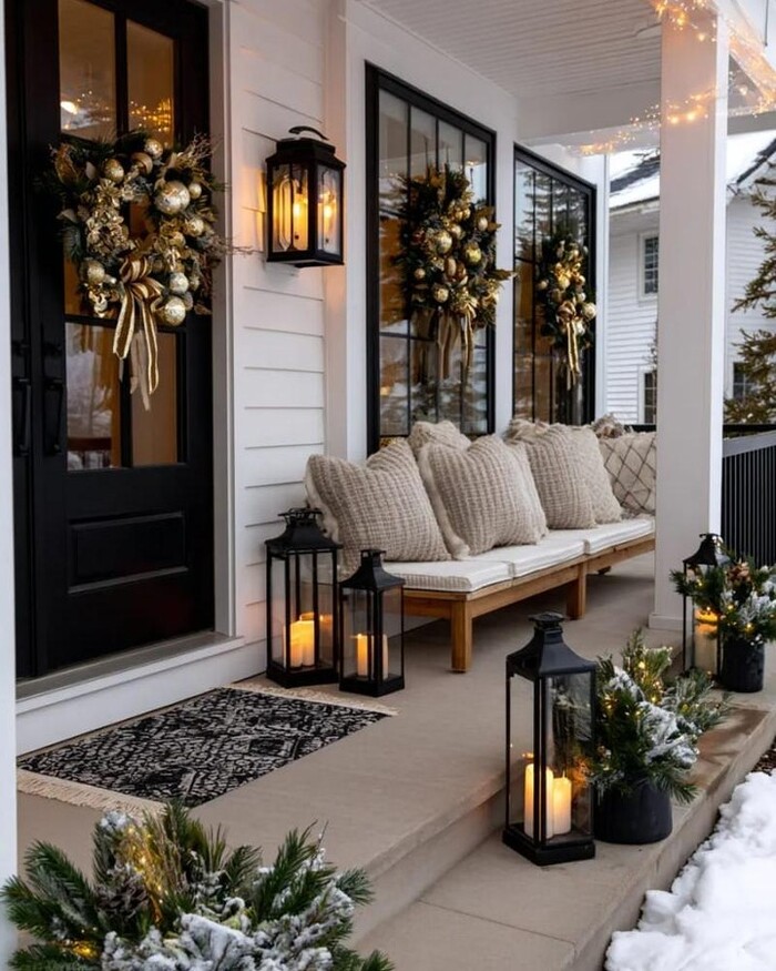 This design whispers luxury but still feels in reach. The black-frame windows and black lanterns echo the door, so every element talks to each other. Those gold-touched wreaths sparkle without blinding the neighbors. And the chunky knit pillows on the bench make you want to sit, even if it’s snowing. For anyone wanting holiday farmhouse front porch decor with calm vibes, this is your blueprint.