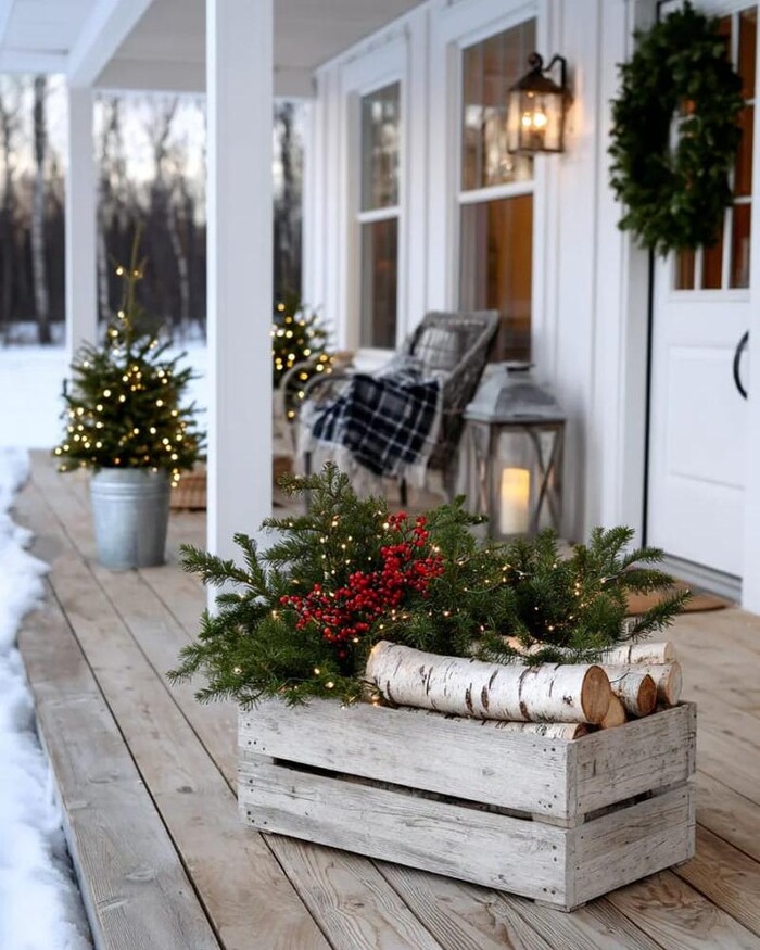 This one had me pausing longer than I should. A weathered wood crate holds cedar cuttings, birch logs, and little red berries, with fairy lights threading through. It looks thrown together in the best way. A tin bucket tree twinkles in the background and the whole porch feels like a cabin weekend. If you want farmhouse porch Christmas decor on a budget, this is it.