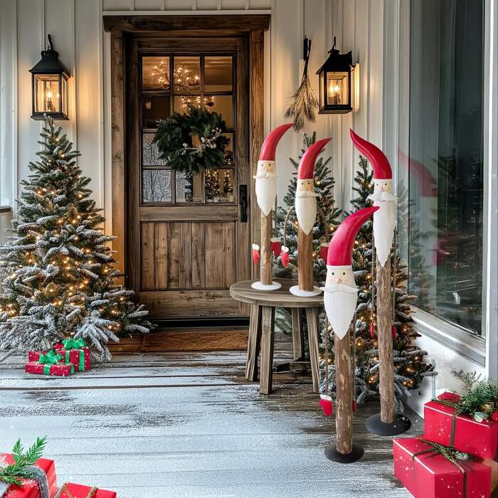 How I’d recreate, pick one hero, the gnomes, then keep everything else lower and slimmer so the scene doesn’t crowd. Use flocked trees with warm micro-lights and one jute-wrapped gift stack on each side for balance. Because wind loves to bully gnomes, screw their bases to round black pavers, then slide the pavers under a thin dusting of faux snow. I’d add one small wreath to the door to anchor the center. It still reads as farmhouse Christmas front porch decor with a Scandinavian wink.
