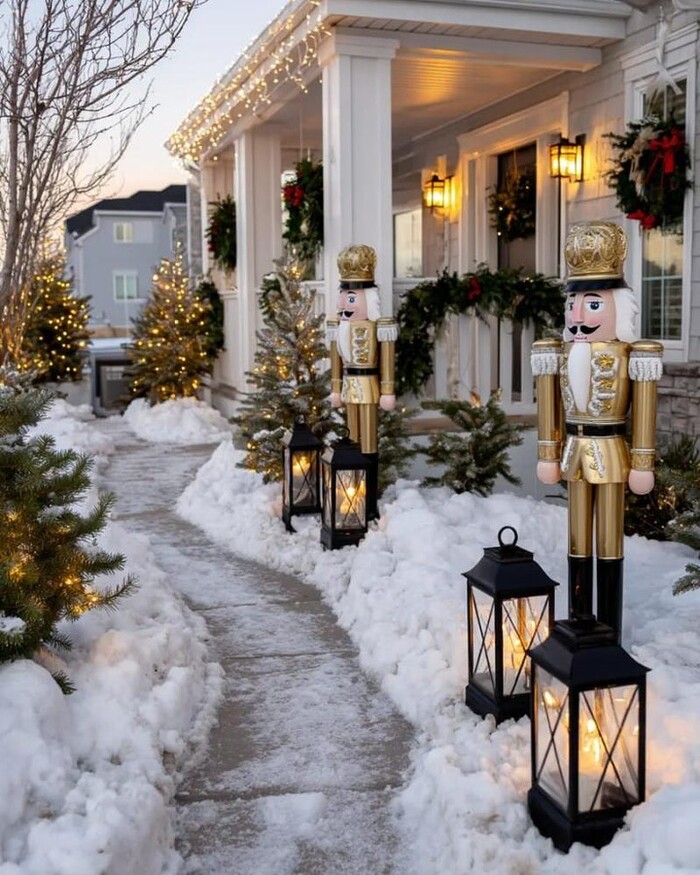 This porch is a holiday movie set. Two gold nutcrackers guard the path, lanterns line the snow, and the porch rail wears garland like a green scarf. The doorway has wreaths and the warm house lights spill onto the snow. If your entry has a long walk, copy this plan for showy Christmas farmhouse front porch decor that neighbors will screenshot.