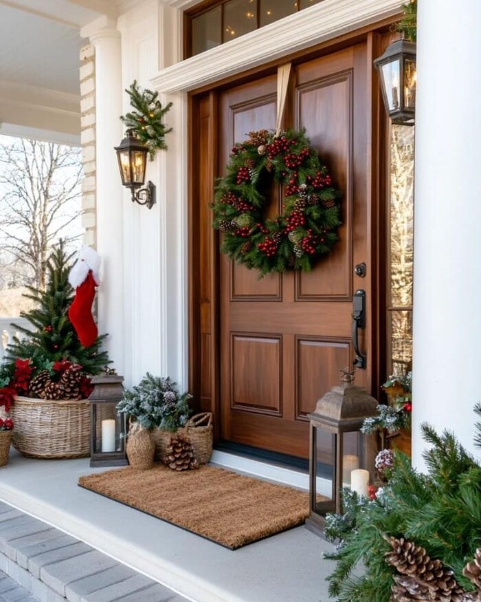 If I had to pick the most timeless porch, it’s this one. The wood door is beautiful on its own, then the wreath with berries brings a friendly smile. On the left, a woven basket stuffed with greens sits next to a small tree. Big lanterns stand like little guardians. The colors are natural, so you never get tired of them. This is textbook front porch farmhouse Christmas style that wins every year.