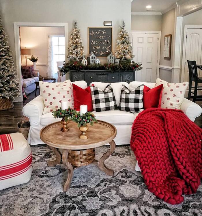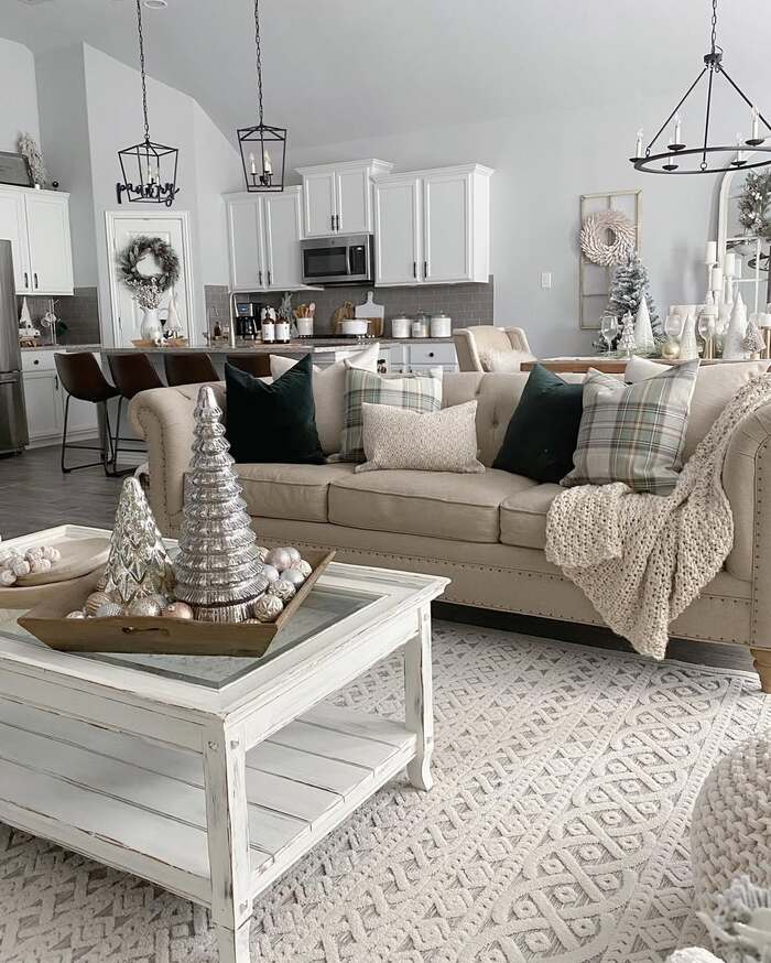 Neutral lovers, this one’s your best friend. Creamy sofas, plaid pillows, and mercury glass trees on the coffee table make everything feel light. I used to fight the urge to mix metals, but in a modern farmhouse holiday living room, silver plus champagne gold looks amazing. Keep the palette soft: oatmeal, sage, and a little evergreen. Then add texture with knits and a chunky throw barely tossed across the arm. Imperfect is cozy.