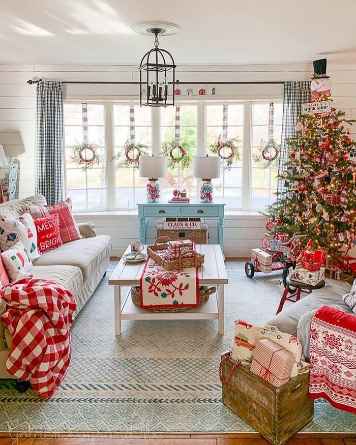 Yes to color. This cheerful room throws plaid pillows, vintage tins, and wreaths on the windows into one happy party. When I collect inspiration for a colorful farmhouse Christmas living room, I start with a tight palette: red, white, and one fun accent. Here the accent is aqua on the small sideboard. Repeat each color at least three times so the eye reads it as a plan, not a mess. The old toy wagon by the tree adds playful character I wish I had growing up.