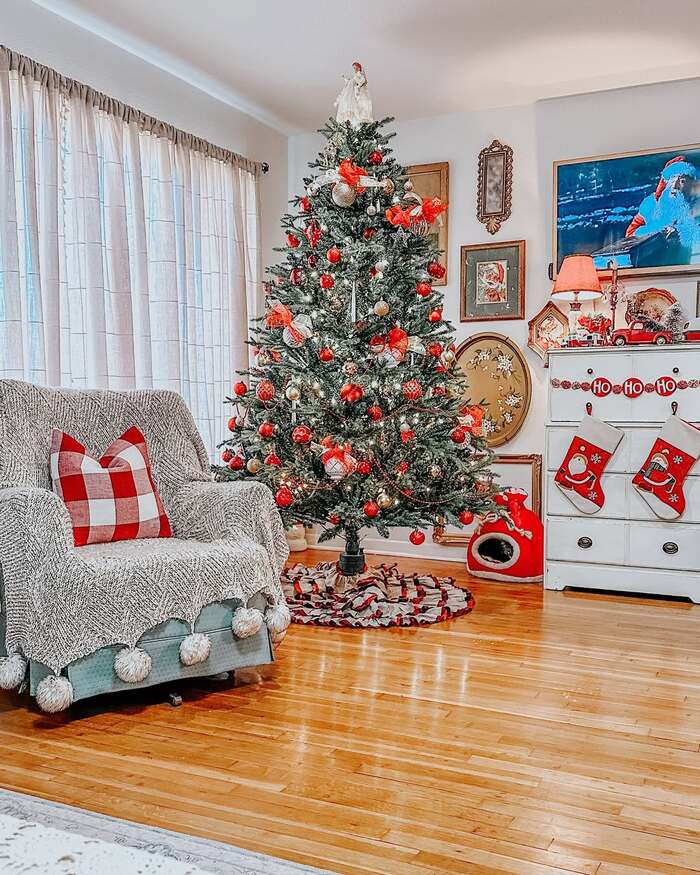 This room brings back every childhood Christmas. The tree is sprinkled with bright red ornaments and vintage-style garlands. A chubby chair with a red buffalo-check pillow sits by a dresser decked with stockings. I like how the gallery wall adds nostalgia with old prints and trays. If you’re worried about mixing frame finishes, don’t be. Vintage looks love a little mismatch.