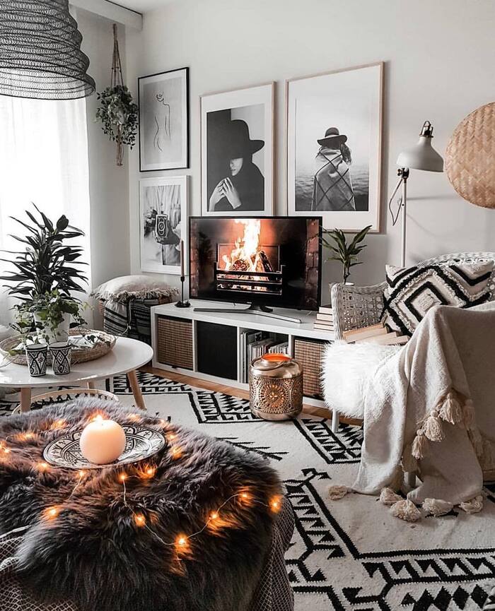 This moody setup proves you can go mostly monochrome and still feel festive. The focus lands on warm fairy lights, soft fur textures, and a gallery wall that brings personality. If your home leans modern, try a black and white palette for your farmhouse holiday living room. Add greenery through plants and a small potted tree rather than a massive evergreen.