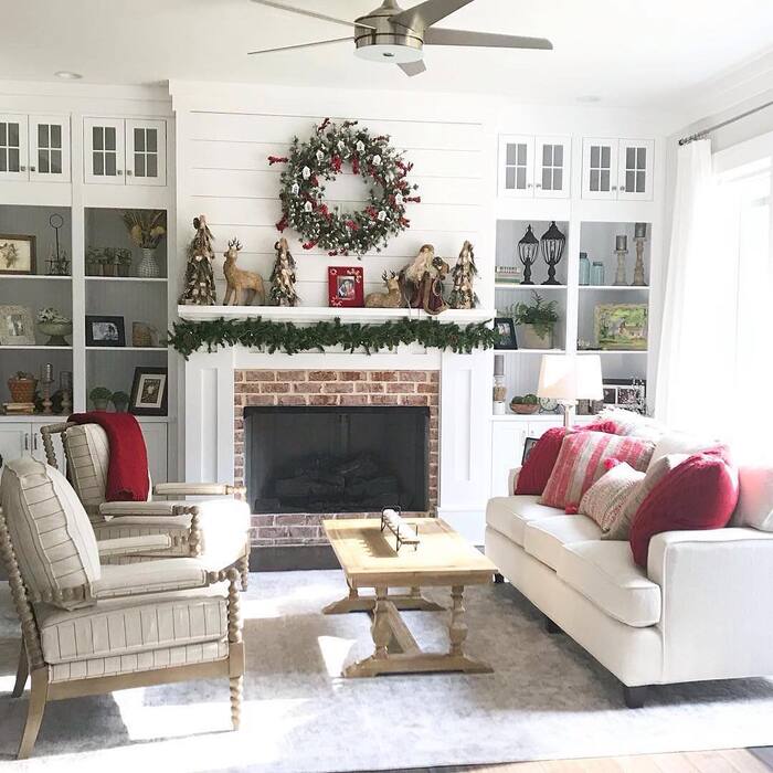 Practical tip if you try this maximal style: group smaller items on trays and in crates so surfaces don’t look scattered. Keep blankets folded on the sofa arms and layer a patterned runner on the coffee table for extra cheer. This is the spirit of living room farmhouse Christmas decorations that feel collected over years. It’s sentimental, imperfect, and honestly, it might be my favorite to scroll because it feels like people actually live there.