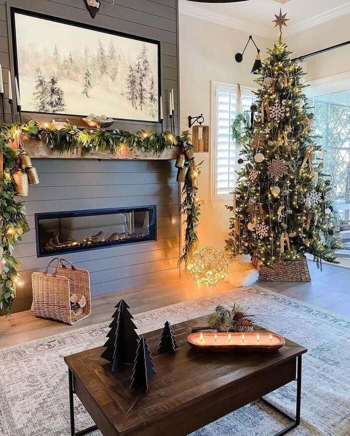 This space leans moodier with a deep gray fireplace wall and twinkly garland studded with bells. The tree sticks to a metallic palette of gold and champagne. If your home has darker walls, embrace them. Light the garland from the inside, not just from the front, so you get dimension. A wicker basket by the hearth and a wood dough bowl full of candles build that rustic farmhouse christmas decor living room warmth without clutter.