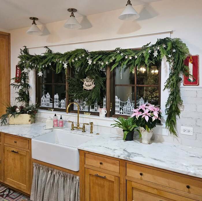 Nothing beats washing dishes under a twinkly window. A thick cedar garland frames the opening and a star banner softens the edges. Down on the glass, delicate white town decals line the sill like a winter storybook. A brass faucet glows against the marble, and a pink poinsettia adds a soft surprise. It’s a classic farmhouse-style Christmas kitchen move that still feels fresh.