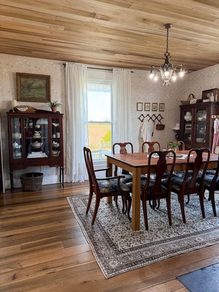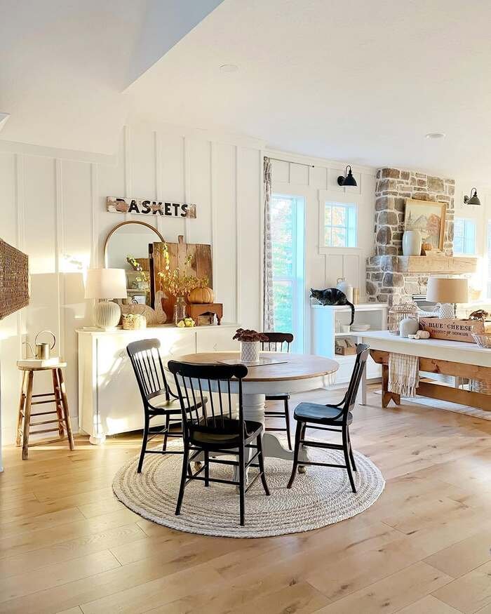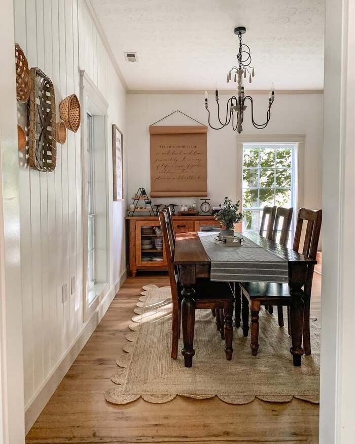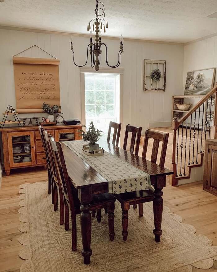 The next dining room takes advantage of natural light to brighten up its rustic elements. The warm wood tones in the table and chairs create a grounded feel, while the light rug and airy window treatments keep the room from feeling too heavy. I’m all about this combination of natural textures and soft, welcoming colors—this room screams comfort.