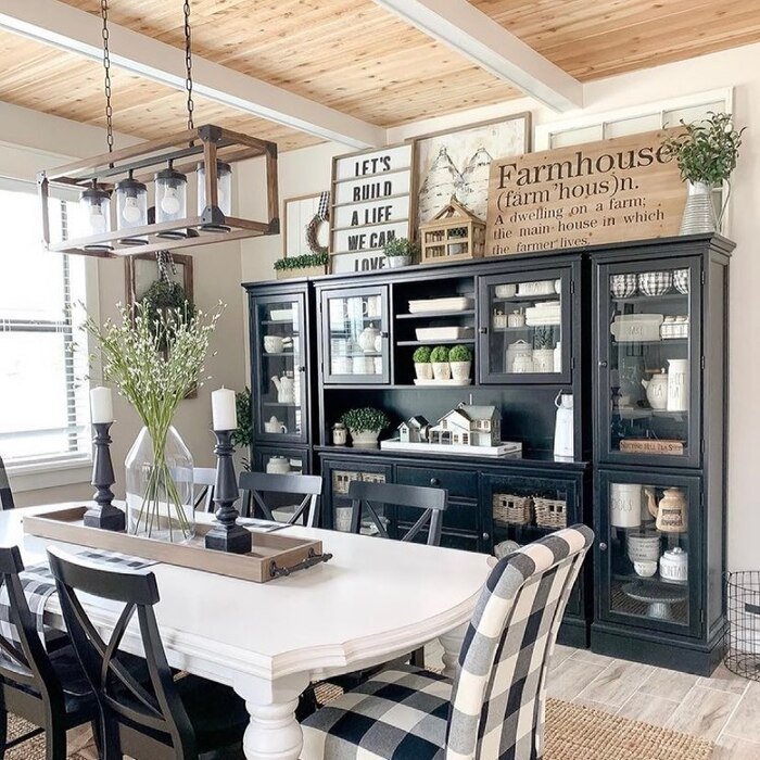 This dining room strikes the perfect balance between elegance and farmhouse charm. The black chairs with white accents add sophistication, while the wooden table keeps the rustic vibe alive. The bold art pieces on the walls, including the large farmhouse sign, tie everything together. The overall feel is one of calm modernity, but it still has that welcoming atmosphere we all crave for the holidays.