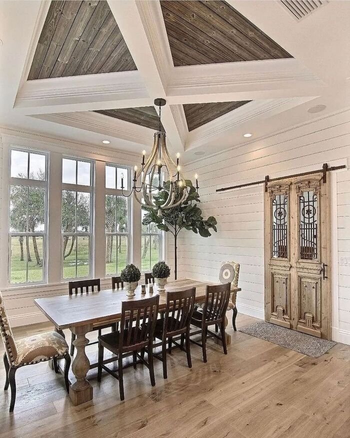 I’m loving this next dining room because it feels fresh and natural, with plenty of natural light coming in through the windows. The dining table is simple but elegant, with a few farmhouse touches like the tall, black chairs. The real star here is the stunning light fixture that hangs over the table, with its clean lines and rustic vibe.