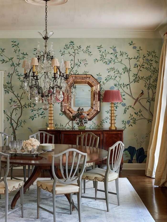 The second new image showcases a dining room with a more luxurious take on farmhouse design, mixing traditional and modern elements. The delicate chandelier, paired with elegant wall sconces, makes the space feel elevated, while the dark wood furniture grounds the room in a more classic style. The beautiful green wall with painted botanical details adds a soft yet sophisticated touch.