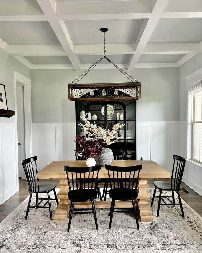 For those who love a bolder look, the next dining room is all about contrasts—black chairs and a wooden table paired with a light-colored rug. The coffered ceiling adds a sense of architectural depth, which is both modern and classic. The room uses a mix of traditional and modern farmhouse elements, creating a space that feels timeless yet updated for the holidays.