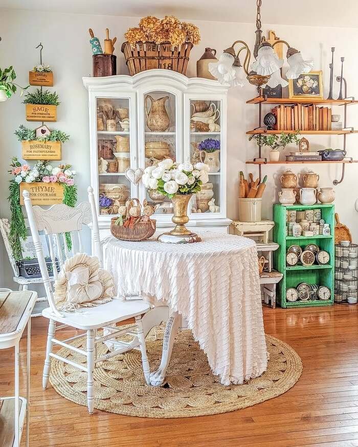This next dining room is all about lightness and airiness, with white walls and a stunning wooden table that exudes warmth. The centerpiece is a large vase of greenery, offering a fresh pop of nature that doesn’t overpower the room. The chandelier adds an elegant touch without being too flashy, keeping things simple but still refined. And the vintage-style cabinet in the background? It’s a beautiful focal point that ties everything together.