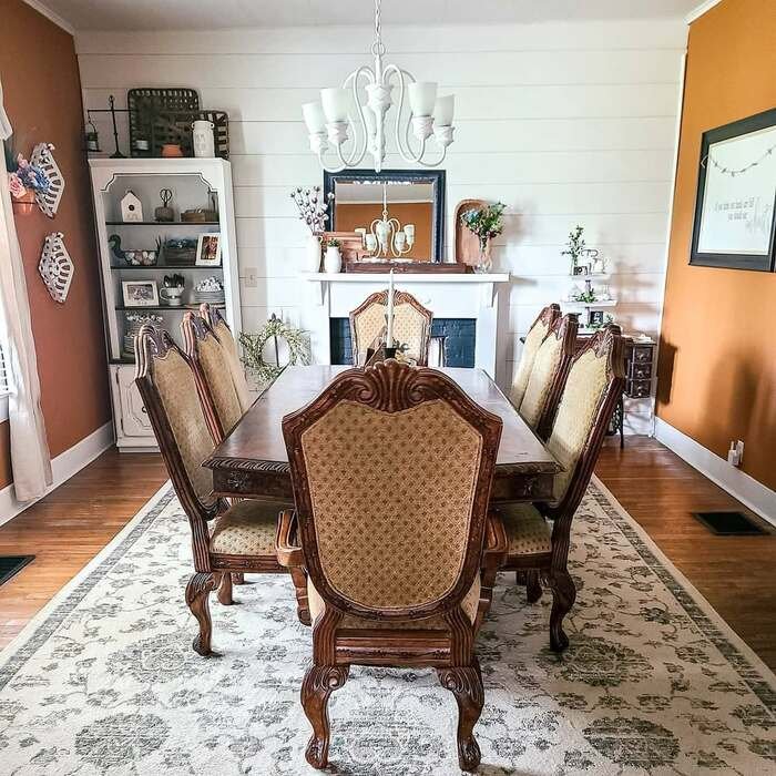 This dining room is a perfect example of how modern farmhouse Christmas decor can be elevated with a touch of vintage charm. The beautiful wooden table, paired with elegant chairs featuring intricate carvings, gives off a timeless and classic feel. The addition of the soft floral rug adds a touch of warmth and creates a cozy atmosphere. The large window in the background floods the room with natural light, making it feel open and inviting.