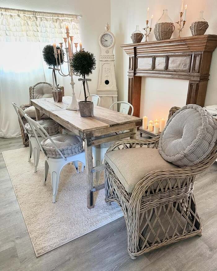 This cozy, relaxed dining room combines modern and farmhouse elements to create a serene space. The soft, neutral tones on the walls and the table create a calm, inviting environment. The woven chairs add texture to the design, while the minimalistic approach to the decor makes it feel light and airy.