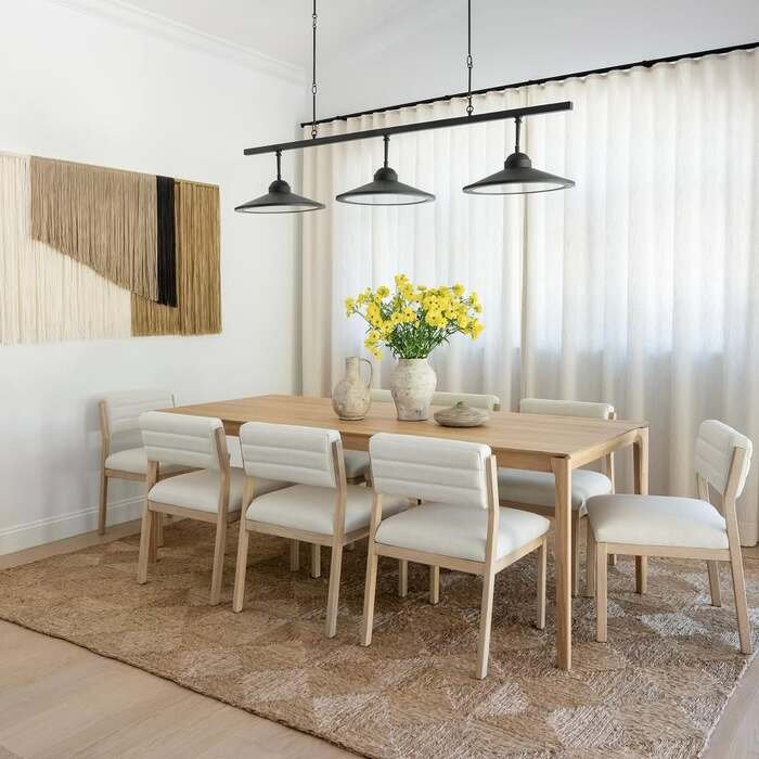 Farmhouse dining room decor ideas that feel airy and calm (the light wood + black pendants look)