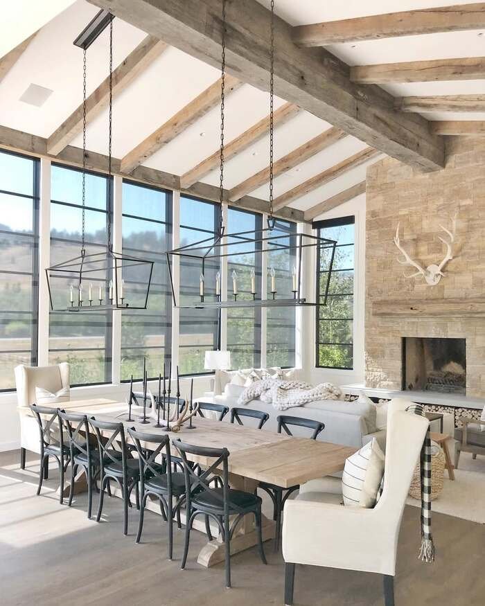 This next one is big and bright and honestly I would probably whisper if I walked in, it feels that nice. The exposed beams, the huge windows, the long table, and the pair of lantern chandeliers make it feel like a modern farmhouse dream. It’s open, but it doesn’t feel empty because the scale is right.