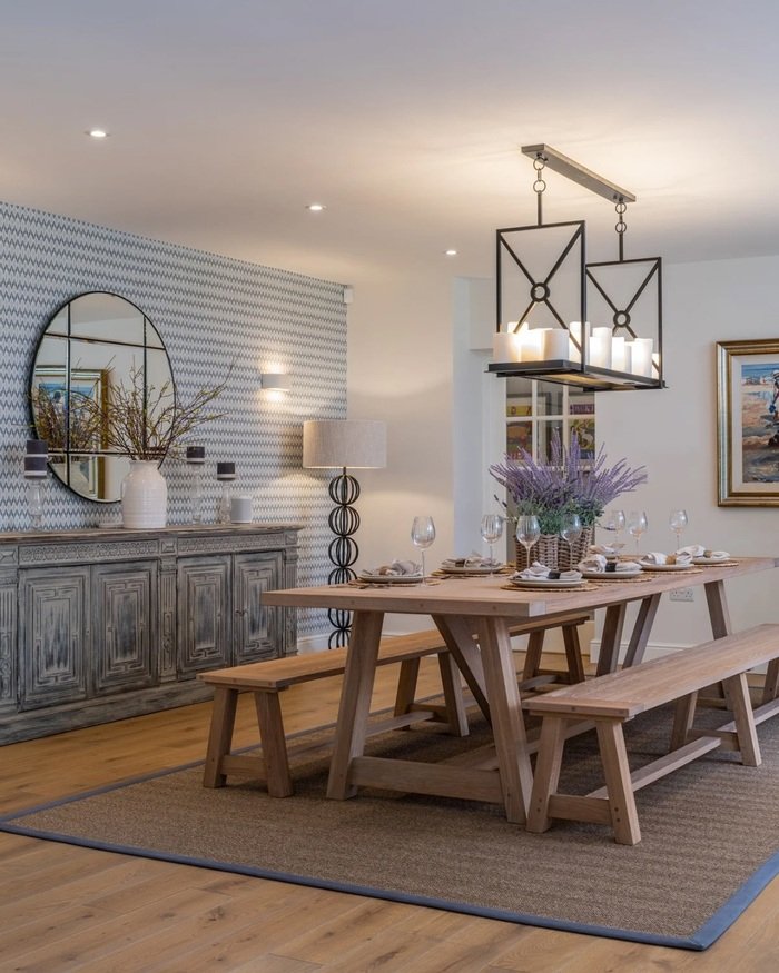 This one feels like “come eat, I made way too much food.” The long wood table with bench seating is such a farmhouse mood. It’s not precious. It’s sturdy. It’s the kind of table where kids can do homework and you can still host a holiday dinner. The oversized lantern light above it makes the whole thing look put together, even if you’re not.