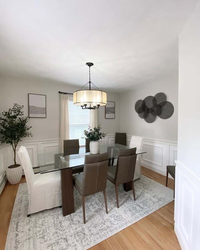 A glass top table sounds fancy, but in this room it still reads farmhouse because of the wall trim and soft colors. The wainscoting is doing a LOT of work here, honestly. It adds that classic farmhouse detail without needing a bunch of clutter. I like that the chairs are darker, too, because it keeps the space from floating away into “all beige everything.”