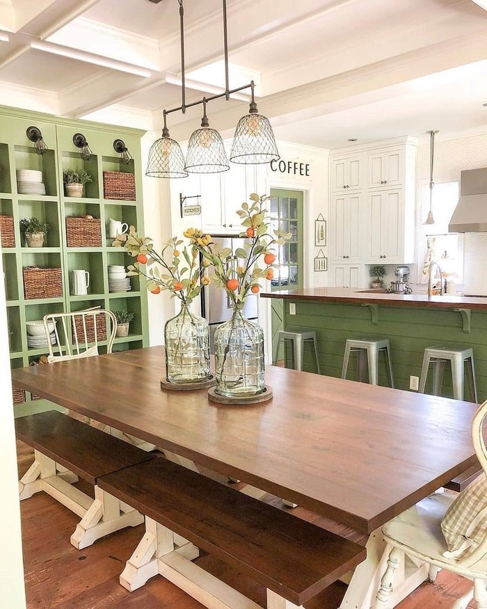 Ok this one is so fun because it mixes dining and kitchen and makes it feel like one big homey zone. That green built-in shelving is the star. It’s filled with baskets and dishes, which is basically farmhouse decorating in one sentence. Then the wood table in front keeps it grounded and family-ish.