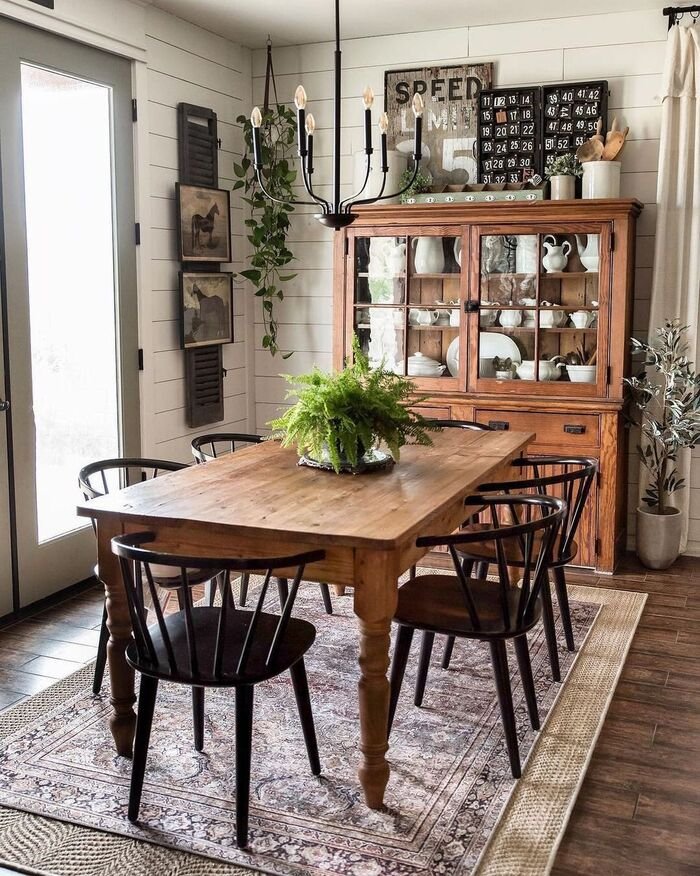 This room has that “little farmhouse breakfast room” energy, even if it’s a full dining room. The wood table is warm and a bit rustic, the black windsor chairs are classic, and the wall looks like shiplap or simple paneling. It’s cozy without trying too hard, which is basically the goal.