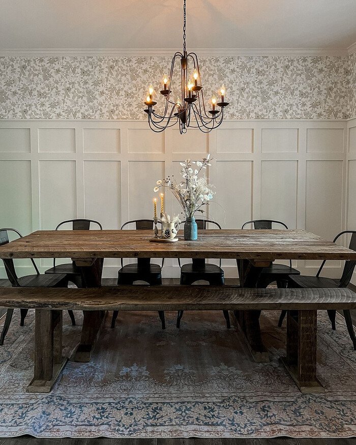 If you want farmhouse dining room decor ideas like this, use layers: paneling or board-and-batten, then wallpaper or a painted strip near the ceiling, then warm lighting. The chandelier is key. It makes dinner feel like an event even if you’re eating pizza. I also love how a long table looks here, because the walls feel strong enough to “hold” it visually. These are traditional farmhouse dining room decor ideas with a little drama.
